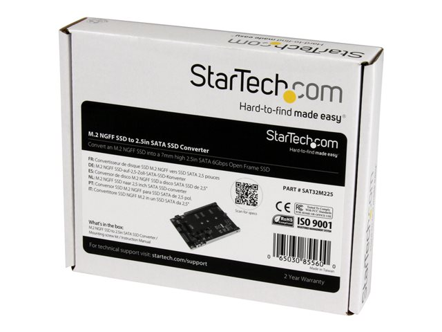 Produktbeskrivning StarTech.com M.2 SATA SSD till 2,5-tums SATA-adapter - M.2 NGFF till SATA-konverterare - 7 mm - Fäste för öppen ram - M2-hårddiskadapter - kontrollerkort - SATA 6Gb/s - SATA 6Gb/s Typ av enhet Kontrollerkort - intern Busstyp SATA 6Gb/s Gränssnitt SATA 6Gb/s Dataöverföringshastighet 6 Gbit/s Enheter som stöds Hårddisk, halvledarenhet Antal kanaler 1 Dimensioner (BxDxH) 7 cm x 10 cm x 0.7 cm Vikt 40 g Tillverkarens garanti 2 års garanti Designat för P/N: BRACKET125PT, BRACKET125PTP, BRACKET225PT, BRACKET425F, SATDOCK5U3ER, SATERASER4, SDOCK1EU3P, SDOCK1EU3P2, SDOCK4U313, SDOCKU313, SDOCKU313E, USB312SAT3, USB31C2SAT3, USB31CSAT3CB - Tillbehör