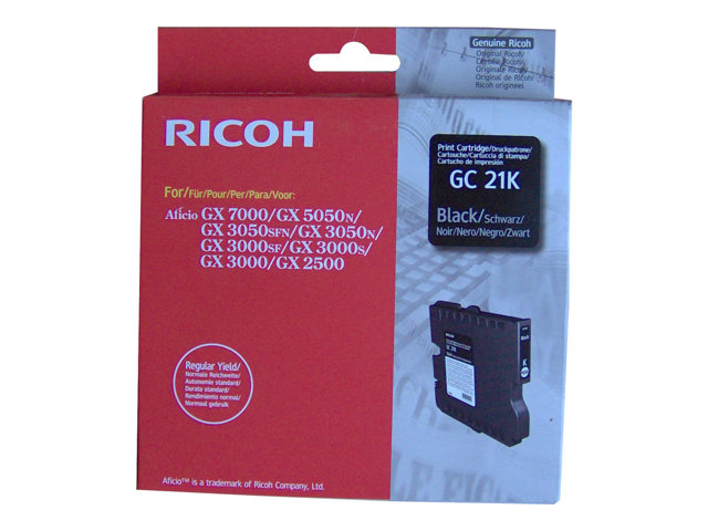Produktbeskrivning Ricoh GC 21K - svart - original - bläckpatron Typ av produkt Bläckpatron Utskriftsteknik Bläckstråle Utskriftsfärg Svart Avkastning Upp till 1500 sidor vid 5% täckning Kompatibel med Ricoh Aficio GX3000, Aficio GX3000S, Aficio GX3000SF, Aficio GX3050N, Aficio GX5050N, GX 2500, GX 3050SFN, GX 7000 - Nedladdningsbara filer
