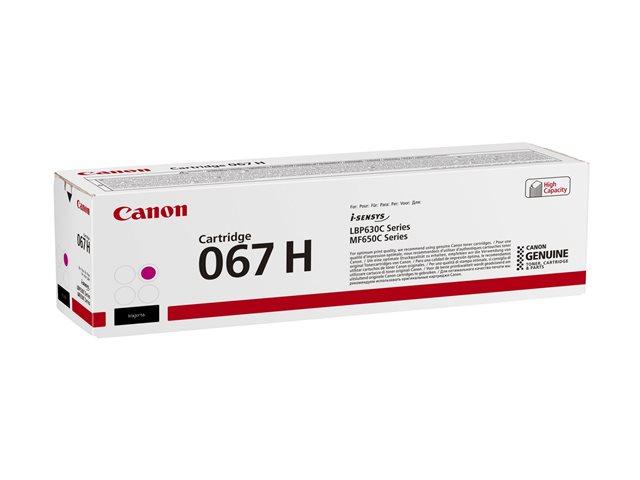Produktbeskrivning Canon 067 H - hög kapacitet - magenta - original - tonerkassett Typ av produkt Tonerkassett Utskriftsteknik Laser Utskriftsfärg Magenta Kassettens kapacitet Hög kapacitet Avkastning Upp till 2350 sidor ISO/IEC 19798 Kompatibel med I-SENSYS LBP631CW, LBP633Cdw - Nedladdningsbara filer