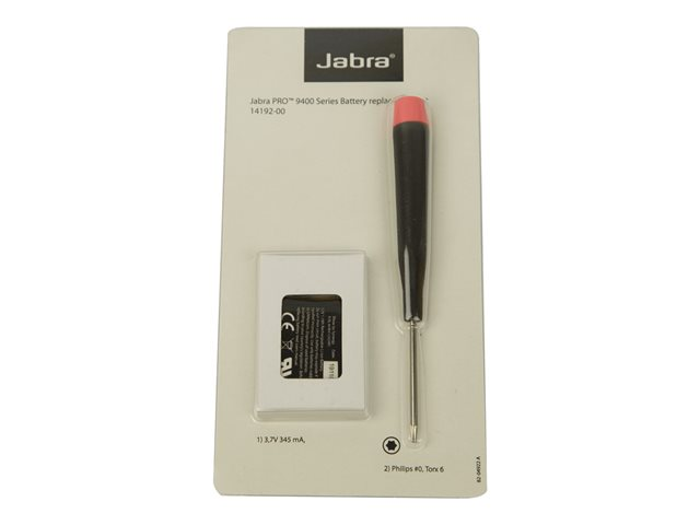 Produktbeskrivning Jabra batteri - Li-Ion Typ av produkt Batteri Utformad för Headset Batteri Litiumjon - 315 mAh Taltid Upp till 480 min Passningstid 100 h Designat för PRO 9450, 9450 Duo, 9450 Duo NCSA, 9450 Flex, 9450 spare headset, 9460, 9460 Duo, 9460 Mono, 9460 NCSA, 9460 spare headset, 9465 Duo, 9470, 9470 Mono, 9470 NCSA, 9470 spare headset - Nedladdningsbara filer