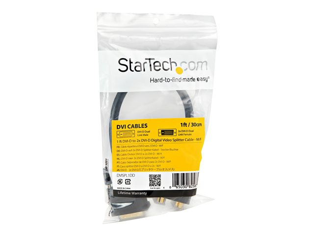 Produktbeskrivning StarTech.com 30 cm DVI-D till 2x DVI-D digital video splitter kabel ? M/F - linjedelare för video - DVI - 30.5 cm Kabel Linjedelare för video - DVI Teknik Skärmad TMDS-länkar Dubbel länk Kabellängd 30.5 cm Färg Svart Kontaktdon 2 x DVI-D - hona Kontakt (andra änden) DVI-D - hane Tillverkarens garanti Begränsad livstidsgaranti Designat för P/N: DVIDDMM1, DVIDDMM10M, DVIDDMM25, DVIDDMM2M, DVIDDMM3M, DVIDDMM5M - Tillbehör
