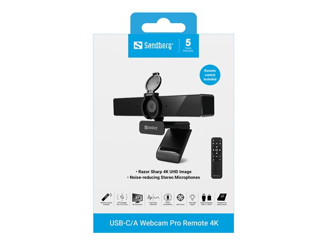 Produktbeskrivning Sandberg Pro Remote - webbkamera Typ av enhet Webbkamera - fast Ljud Ja: inbyggda dubbla riktiga mikrofoner Kameramonteringstyp Klämfäste Dimensioner (BxDxH) 15.18 cm x 5.42 cm x 4.16 cm Vikt 255 g Anslutningsteknik Kabelanslutning Kamera Färg Max upplösning 3840 x 2160 Bildhastighet (max) 30 frames per second Videoformat 4K Bildsensortyp 8 MP Fokuseringsjustering Automatisk Gränssnitt USB Medföljande kablar 1 - USB-C till USB-C-kabel - extern - 2 m