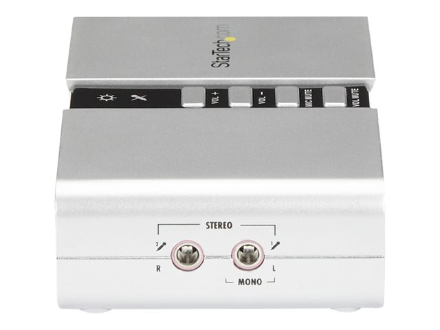 Produktbeskrivning StarTech.com 7.1 USB-audio-adapter externt ljudkort med SPDIF digital audio - ljudkort - USB 2.0 Typ av enhet Ljudkort Modell Extern Typ av gränssnitt USB 2.0 Dimensioner (BxDxH) 10 cm x 6 cm x 2.5 cm Vikt 100 g Färg Silver Ljudutgångsläge 7.1-kanals surround Samplingsfrekvens 48 kHz (max) Maskinvarostyrenheter och indikatorer Volymkontroll, dämpningsknapp Systemkrav Microsoft Windows 2000 Server, Microsoft Windows Vista (32/64 bits), Microsoft Windows 7 (32/64 bits), Microsoft Windows XP (32/64 bits), Microsoft Windows Server 2003 (32/64-bits), Windows 8 (32/64 bitars), Microsoft Windows Server 2008 R2 (32/64-bitars), Windows 8.1 (32/64 bitars), Windows 10 (32/64 bits) Tillverkarens garanti 2 års garanti Designat för P/N: MU15MMS, MU6MMS - Tillbehör