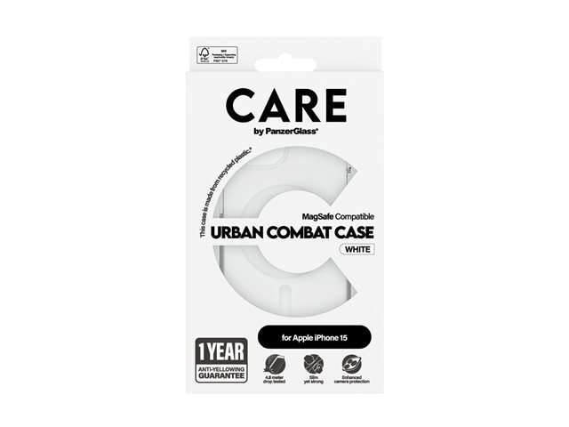 Produktbeskrivning CARE by PanzerGlass Urban Combat - baksidesskydd för mobiltelefon Typ av produkt Baksidesskydd för mobiltelefon - MagSafe-kompatibilitet Dimensioner (BxDxH) 7.7 cm x 1.3 cm x 15.2 cm Vikt 35 g Material Termoplastisk polyuretan (TPU), polykarbonat (PC), oleofobisk beläggning Färg Vit, transparent Återvunnet produktinnehåll 100 % - tillverkad av återvunnen plast Tillverkarens garanti 1 års garanti Designat för Apple iPhone 15 - Nedladdningsbara filer