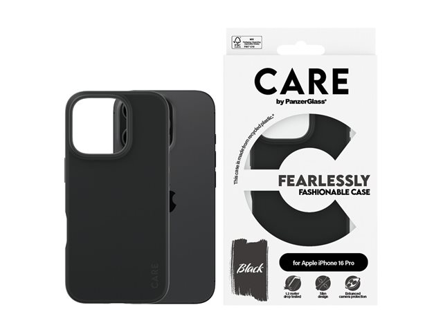 Produktbeskrivning CARE by PanzerGlass - baksidesskydd för mobiltelefon Typ av produkt Baksidesskydd för mobiltelefon Dimensioner (BxDxH) 7.485 cm x 1.441 cm x 15.301 cm Vikt 25 g Material Termoplastisk polyuretan (TPU), silikonbeläggning Färg Svart Återvunnet produktinnehåll 100 % - tillverkad av återvunnen plast Designat för Apple iPhone 16 Pro - Tillbehör