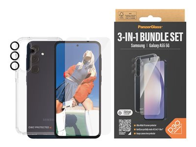 Produktbeskrivning PanzerGlass - 3-i-1-skyddspaket - baksidesskydd för mobiltelefon Typ av produkt Baksidesskydd för mobiltelefon Kombinerad med Skärm- och objektivskydd Material D3O Bio, 100 % återvunnen plast Designat för Samsung Galaxy A55 - Nedladdningsbara filer