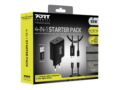 Produktbeskrivning PORT Connect - 4-in-1 Starter Pack - strömadapter - USB, 24 pin USB-C - 65 Watt - med USB-C-kabel, USB-C till HDMI-kabel, USB-C till USB-A-adapter Typ av produkt Strömadapter Kombinerad med USB-C-kabel, USB-C till HDMI-kabel, USB-C till USB-A-adapter Utformad för Anteckningsbok, surfplatta, mobiltelefon Dimensioner (BxDxH) 2.8 cm x 8.3 cm x 4.6 cm Vikt 90 g Typ av utkontakt Total 2: USB, 24 pin USB-C - på kabel: USB-C Nätspänning AC 100-240 V (50/60 Hz) Tillförd spänning 5 / 5 - 11 / 5 - 16 / 9 /12 / 15 / 20 V Max elektrisk ström 4.05 A Snabbladdningsteknik Qualcomm Quick Charge 3.0, Power Delivery, PD/PPS Effekt 65 Watt Strömenhetens driftlägen USB-C 5/9/12/15/20 V - 3/3/3/3/3.25 A