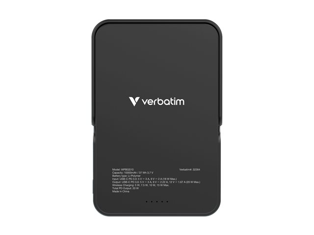 Produktbeskrivning Verbatim Charge 'n' Go trådlös powerbank - magnetisk, med stativ - Li-pol - 24 pin USB-C - 20 Watt Typ av produkt Trådlös powerbank Utformad för Mobiltelefon, surfplatta Dimensioner (BxDxH) 7.1 cm x 10.7 cm x 1.55 cm Vikt 217.8 g Färg Svart Typ av utkontakt 24 pin USB-C Tillförd spänning 12 V Max elektrisk ström 3 A Snabbladdningsteknik Power Delivery Trådlös laddning Ja Batteri Litiumpolymer - 10000 mAh Effekt 20 Watt Strömenhetsinformation - 24-stifts USB-C - inmatning - 9 V - 18 W - 2 A