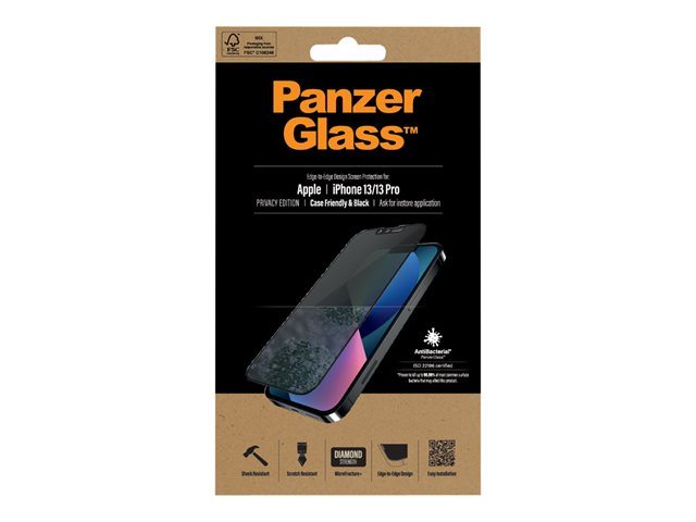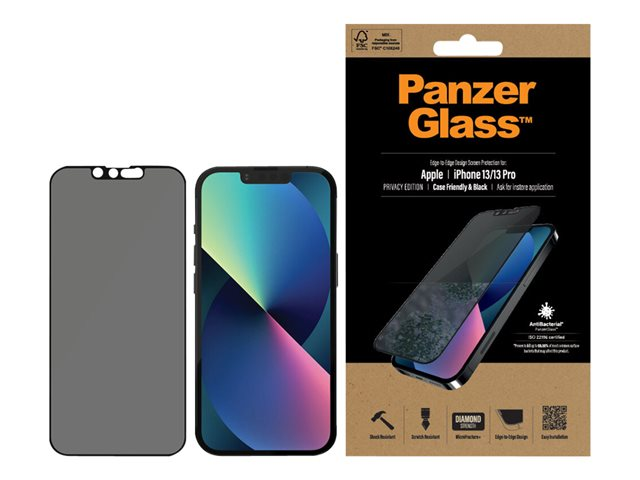 Produktbeskrivning PanzerGlass - skärmskydd för mobiltelefon Typ av produkt Skärmskydd - glas - med sekretessfilter Avsedd för Mobiltelefon Skydd Antibakteriell, reptålig, stötsäkert, fingeravtrycksresistent Beläggning Oleofob Produktmaterial Härdat glas Ramfärg Svart Designat för Apple iPhone 13, 13 Pro - Nedladdningsbara filer