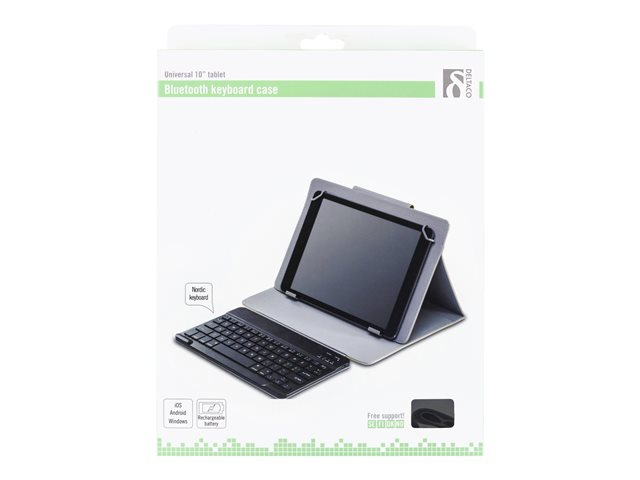 Produktbeskrivning DELTACO TB-138 - tangentbord och foliefodral - Nordisk - svart Inmatningsenhet Typ av enhet Tangentbord och foliefodral Gränssnitt Bluetooth Lokalisering och layout Nordisk Färg Svart tangentbord, svart fodral Tillverkarens garanti 5 års garanti - Nedladdningsbara filer