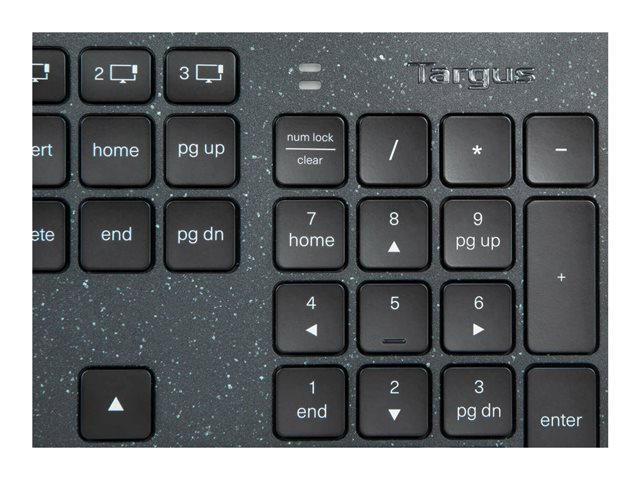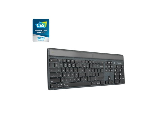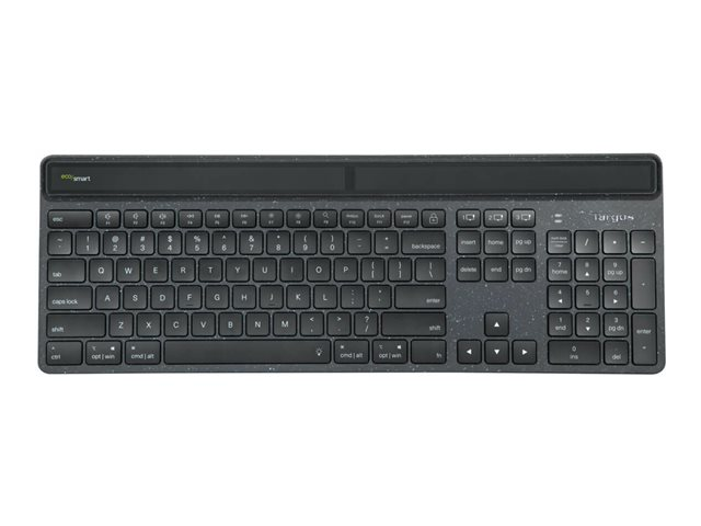 Produktbeskrivning Targus EcoSmart - tangentbord - hållbar energiutvinning - QWERTY - Nordisk - svart Inmatningsenhet Typ av enhet Tangentbord Bakgrundsbelyst Nivå 3 Gränssnitt Bluetooth 5.0 Anslutningsteknik Trådlös Lokalisering och layout QWERTY Nordisk Skydd DefenseGuard antimikrobiellt skydd Numeriskt tangentbord Ja Nyckellåstyp Saxnyckel Färg Svart Dimensioner (BxDxH) 41.6 cm x 14.8 cm x 2.1 cm Vikt 840 g Förpackningstyp Recycled packaging Tillverkarens garanti 2 års garanti - Nedladdningsbara filer