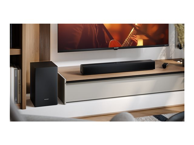 Produktbeskrivning Sharp HT-SBW121 - soundbar - för tv - trådlös Typ av produkt Soundbar - för tv - 2.1-kanals Källa för medieinnehåll USB-värd Systemkomponenter Bashögtalare, soundbar Högtalartyp Aktiv Toppström för ljudsystem (totalt) 240 Watt Förstärkare Integrerad Gränssnitt Bluetooth Ljudformat MP3, WAV Färg Mattsvart Ljudeffekter Röstläge, filmläge, sportläge, spelläge, nattläge, Music mode, Anpassat läge Strömtillförsel AC 100-240 V (50/60 Hz) Strömalternativ Automatisk på-/avslagning - Nedladdningsbara filer