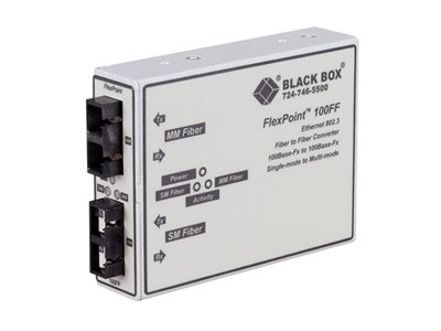 Produktbeskrivning Black Box FlexPoint Modular Media Converter - medieomvandlare - 100Mb LAN Typ av enhet Medieomvandlare - SC-läge (multi-mode) / SC enkelläge Formfaktor Extern Typ av kablage 100Base-FX Dataöverföringshastighet 100 Mbps Optisk våglängd 1300 nm Datalänkprotokoll 100Mb LAN Max överföringsavstånd 28 km Dimensioner (BxDxH) 7.6 cm x 10.2 cm x 2.5 cm - Tillbehör