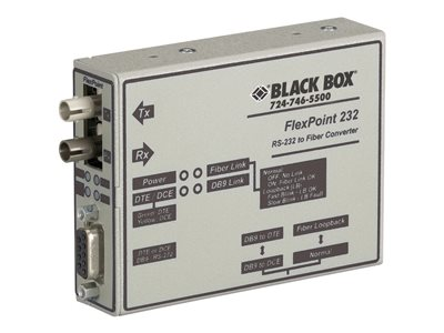 Produktbeskrivning Black Box FlexPoint RS-232 to Fiber Converter - medieomvandlare - RS-232 Typ av enhet Medieomvandlare - 9 pin D-Sub (DB-9) / ST Formfaktor Extern Datalänkprotokoll RS-232 Max överföringsavstånd 2.5 km Dimensioner (BxDxH) 7.6 cm x 10.2 cm x 2.5 cm Tillverkarens garanti 2 års garanti - Tillbehör