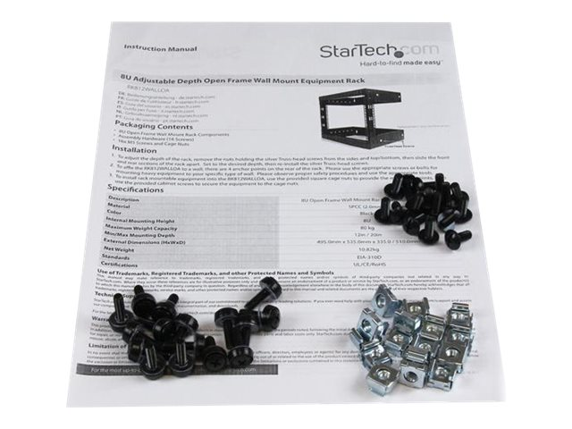 Produktbeskrivning StarTech.com 8U 19" Wall Mount Network Rack - 12" Deep 2 Post Open Frame Server Room Rack for Data/AV/IT/Computer Equipment/Patch Panel with Cage Nuts & Screws 135lb Capacity, Black (RK812WALLO) - rack - 8U Produkttyp Rack Färg Svart Stativstorlek 19" Höjd (U-format) 8U Produktmaterial Stål Dimensioner (BxDxH) 50.5 cm x 30.8 cm x 35.6 cm Vikt 8 kg Designat för P/N: CABCAGENUTS6, CABSCREWM5, CABSCREWM52, CABSCREWM6, CABSCREWM62, CABSCREWS, CABSCREWSM6, CABSCRWM520, CABSCRWM620, CABSCRWS1224 - Tillbehör
