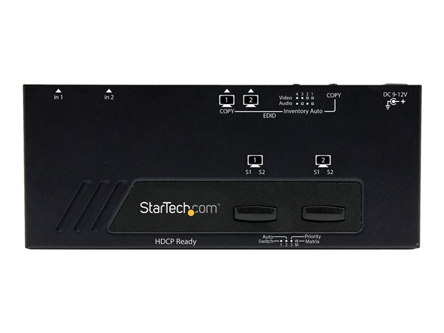 Produktbeskrivning StarTech.com 2x2 HDMI Matrix Switch with Remote - 1080p Automatic & Priority Switcher - Video Wall Auto Selector Splitter Box - Audio Out (VS222HDQ) - video-/ljudomkopplare - 2 portar Typ av enhet Video-/ljudomkopplare - 2 portar Undertyp HDMI Funktioner HDCP-kompatibel Strömtillförsel AC 120/230 V Dimensioner (BxDxH) 15.6 cm x 6.5 cm x 2 cm Vikt 278 g Färg Svart Lokalisering Storbritannien, Förenta Staterna, Europa Tillverkarens garanti 2 års garanti Designat för P/N: SVA12M2NEUA, SVA12M5NA - Tillbehör