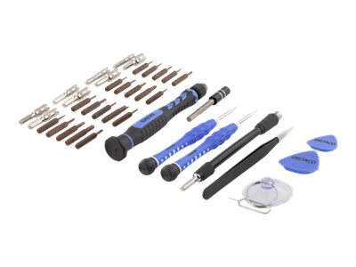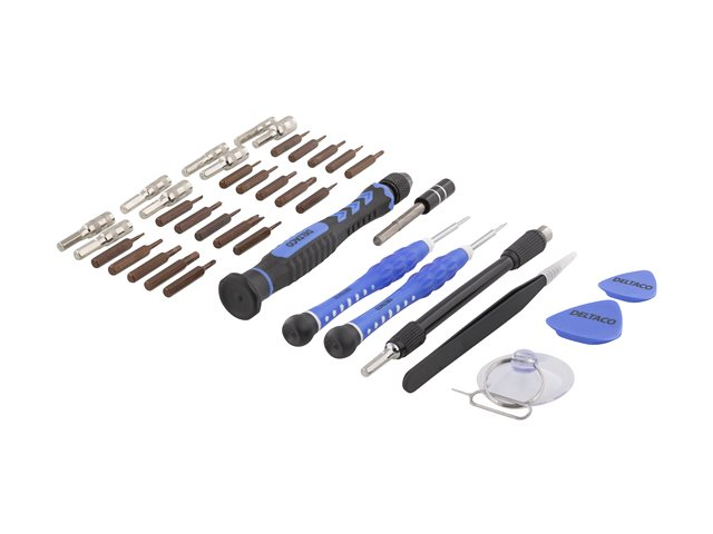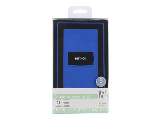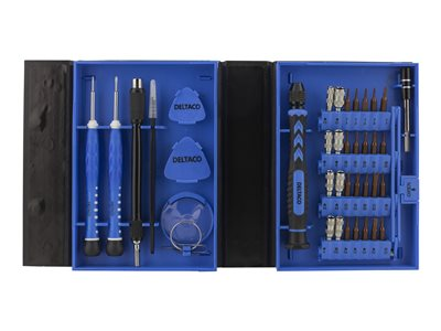 Produktbeskrivning DELTACO Smartphone Repair Kit VK-51 - verktygskit - 38 delar Produkttyp Verktygskit - 38 delar Förpackningsinnehåll Skruvmejselhandtag, skruvmejselbit - phillips PH2, skruvmejselbit - skruvnyckel 2,6 mm, sugkopp, utmatningsverktyg för SIM-kort, öppningshacka, förlängningsstång, 2 skruvmejselbits - spår 1,5, 2 mm, skruvmejselbit - tri-wing 2 mm, 2 skruvmejselbitar - pentalobe 0,8; 1,2 mm, skruvmejselbit - tre blad, 2,3 mm, skruvmejselbit - iPhone standoff, 5 skruvmejselbitar - torx T3, T4, T5, T6, T7, 4 skruvmejselbits - hex 0,9, 1,5, 2, 3 mm, 4 skruvmejselbitar - phillips 1,2; 1,5; 2; 3 mm, flexibel förlängningsaxel, ESD-säkra pincetter Färg Blå Hållare Fodral - Nedladdningsbara filer