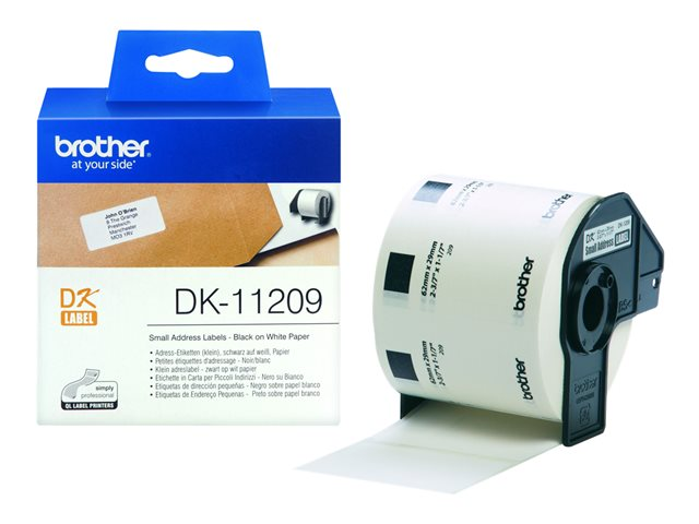 Produktbeskrivning Brother DK-11209 - adresslappar Typ av produkt Adresslappar Utskriftsteknik Direkttermo Mediefärger Svart på vitt Antal kort/etiketter per ark/rulle 800 Kompatibel med Brother QL-1050 TypeA, QL-1050N, QL-500A, QL-500A (50TH Year Anniversary Model), QL-500BS, QL-500BW, QL-550, QL-560, QL-560VP, QL-570, QL-650TD, QL-710W, QL-710WSP, QL-720NW, QL-820NW - Tillbehör