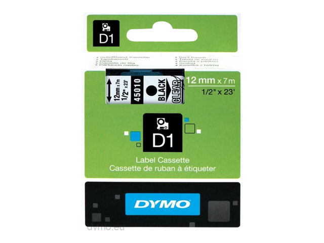 Produktbeskrivning DYMO D1 - etiketttejp - 1 kassett(er) - Rulle (1,2 cm x 7 m) Typ av produkt Etiketttejp Limtyp Självhäftande Mediastorlek Rulle (1,2 cm x 7 m) Utskriftsteknik Termisk överföring Mediefärger Svart på transparent Medföljande antal 1 kassett(er) Kompatibel med LabelMANAGER 100, 100+, 100H, 120P, 150, 160, 160P, 200, 210D, 220P, 260P, 280, 280P, 300, 350, 350D, 360D, 400, 420P, 450, 450D, 500TS, PC, PC2, PnP, Wireless PnP; LabelPOINT 100, 150, 200, 250, 300, 350; DYMO LabelWriter 450 - Nedladdningsbara filer