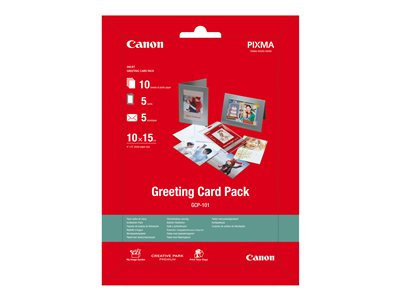 Produktbeskrivning Canon Greeting Card Pack GCP-101 - set med fotopapper - 10 ark - 100 x 150 mm - 170 g/m² Typ av produkt Set med fotopapper Mediastorlek 100 x 150 mm Utskriftsteknik Bläckstråle Medievikt 170 g/m² Medföljande antal 10 ark - Nedladdningsbara filer