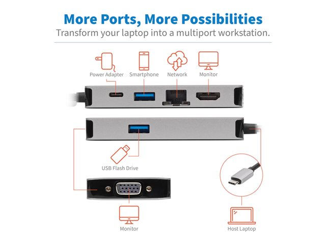 Produktbeskrivning Eaton Tripp Lite Series USB-C Portable Docking Station - HDMI 4K @ 30 Hz, VGA, USB-A/USB-C, GbE, PD Charging 3.0, Gray - dockningsstation - USB-C - VGA, HDMI, USB-C - 1GbE Typ av produkt Dockningsstation Dockningsgränssnitt USB-C Videogränssnitt VGA, HDMI, USB-C Dimensioner (BxDxH) 9.4 cm x 4.83 cm x 1.52 cm Vikt 81.6 g Färg Grå Nätverk Gigabit Ethernet Tillverkarens garanti 3 års garanti - Tillbehör