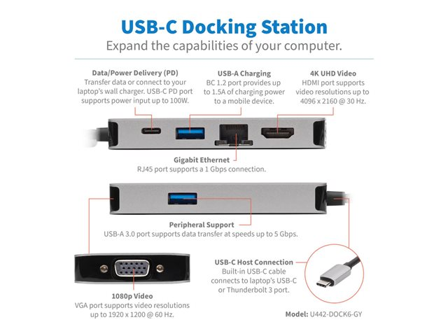 HDMI 4K @ 30 Hz, VGA, USB-A/USB-C, GbE, PD Charging 3.0, Gray - dockningsstation - USB-C - VGA, HDMI, USB-C - 1GbE