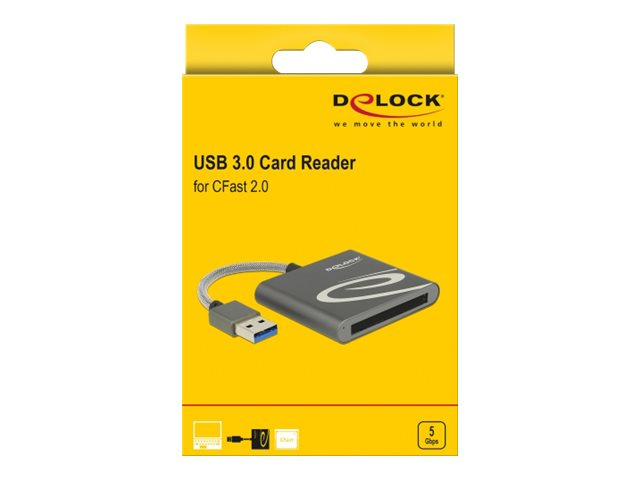 Produktbeskrivning Delock kortläsare - USB 3.0 Produkttyp Kortläsare - extern Minneskort som stöds CFast-kort typ I, CFast-kort typ II Värdgränssnitt USB 3.0 Färg Antracit - Nedladdningsbara filer
