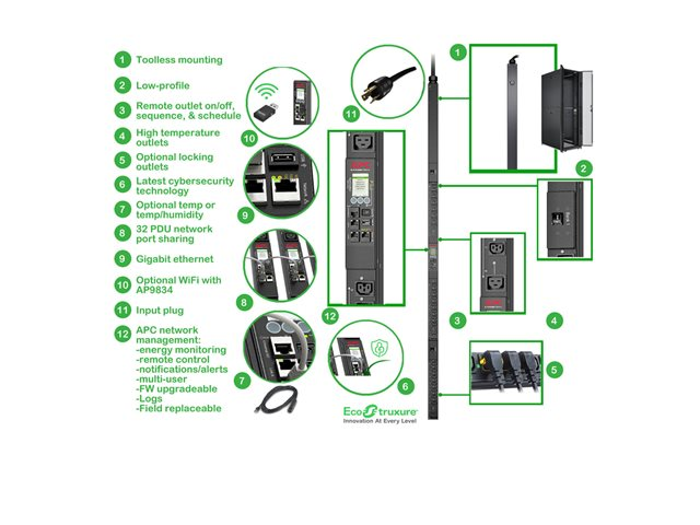 Produktbeskrivning APC Rack PDU 9000 Switched APDU9941 - kraftdistributionsenhet - 4992 VA Typ av enhet Kraftdistributionsenhet - kan monteras i rack Sladdlängd 3 m Stativstorlek 0U Vikt 8.5 kg Inspänning AC 200/208 V Utspänning AC 200/208 V Effektkapacitet 4992 VA Inmatningsanslutningar 1 x power NEMA L6-30P Utdatakontakter 21 x effekt IEC 60320 C13/C15