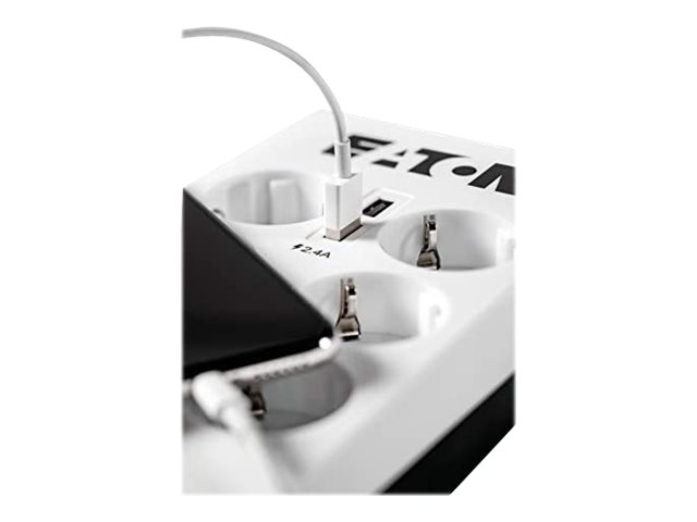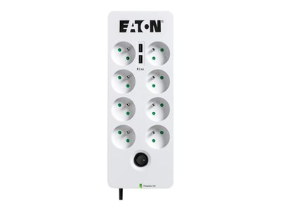 Produktbeskrivning Eaton Protection Box - överspänningsskydd - 2500 Watt Typ av enhet Överspänningsskydd - extern Vikt 713 g Inspänning Växelström 220-250 V Effektkapacitet 2500 Watt Inmatningsanslutningar 1 Utdatakontakter 8 x ström